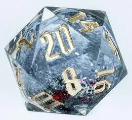 This festive 54mm Snowglobe d20 contains glitter and snowflakes that float when rolled.